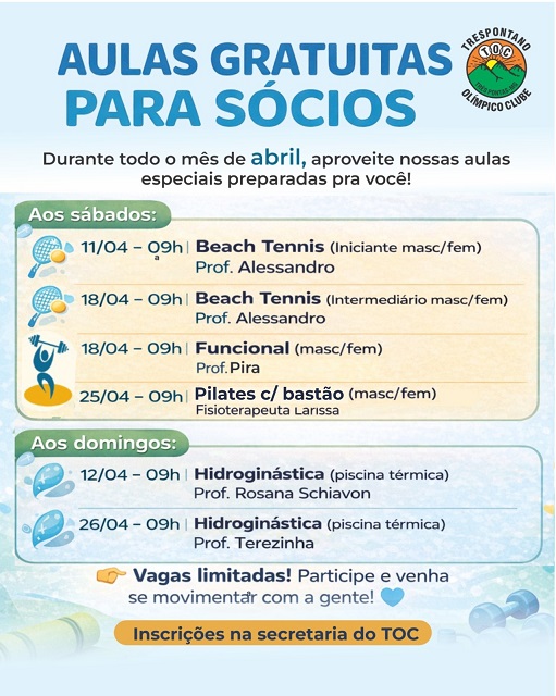 Cuidar do corpo e da mente, cultivar hábitos saudáveis e fortalecer vínculos sociais são atitudes que fazem diferença no dia a dia – e iniciativas locais que estimulam esse movimento merecem destaque. Durante todo o mês de abril, o Trespontano Olímpico Clube (TOC) oferece uma programação de aulas gratuitas voltadas aos sócios, reunindo modalidades que combinam bem-estar, atividade física e momentos de integração, de acordo com o Clube.