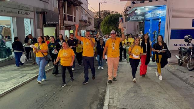 Antes disso, alunos de escolas municipais, estaduais e de centros municipais de educação infantil participaram ativamente das ações, confeccionando desenhos e vídeos que foram exibidos em um telão instalado na Praça da Fonte. O espaço foi cuidadosamente decorado com flores amarelas, símbolo da campanha, e com os desenhos das crianças expostos entre bexigas penduradas em árvores criando um cenário de cor, sensibilidade e engajamento.