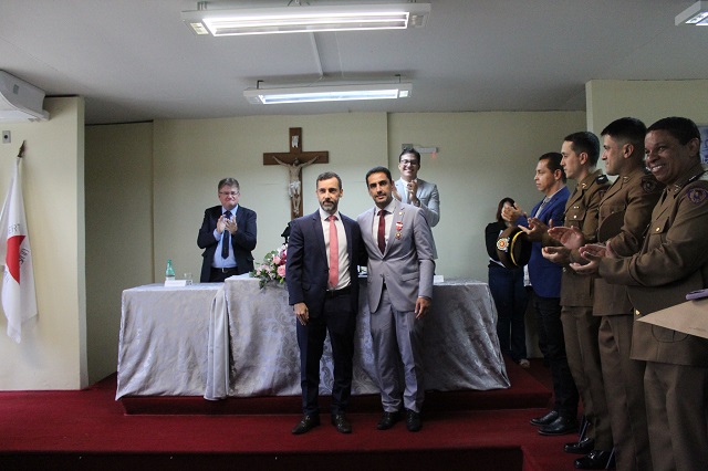 “Ter meu nome indicado foi especial. Para mim é uma grande honra, pois sei que é a coroação de um projeto muito bem executado nos últimos anos pela equipe da Polícia Civil em Três Pontas. Eu tive que me controlar, eu sabia que a emoção viria”, comentou o delegado da Polícia Civil do Estado de Minas Gerais, Dr. Gustavo Gomes, na cerimônia de entrega da Medalha Desembargador Hélio Costa, realizada na tarde desta quarta-feira (10), no Salão do Tribunal do Júri “Dr. Antônio Mauro Simões Machado” – Fórum da Comarca de Três Pontas. A comenda, instituída pelo Tribunal de Justiça (TJMG), se destina a agraciar pessoas que venham prestando ou tenham prestado relevantes serviços ao Poder Judiciário local. “Ver pai, mãe, filhos acompanhando a gente receber uma honraria como esta é muito cativante, porque somos exemplo para os filhos, mas seguimos exemplos dos pais. Essa é a sequência da vida e, para mim, tê-los aqui foi muito gratificante”, completou o homenageado, relembrando o momento em que precisou ser ainda mais forte para seguir com seu discurso.