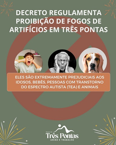 Em Três Pontas, Lei proíbe a venda, manuseio, utilização, queima e soltura de fogos de estampido e artefatos pirotécnicos de efeito sonoro ruidoso em todo o território municipal. A medida visa garantir o bem-estar de idosos, bebês, pessoas com Transtorno do Espectro Autista (TEA) e animais, além de promover um meio ambiente mais harmônico e equilibrado