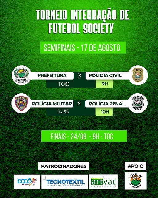 Com estes resultados, no dia 17 de agosto, as equipes da Prefeitura e Polícia Civil estarão novamente no Campo de Futebol Society “José Carlos Veloso”, agora para disputar as semifinais. A partida terá início às 9 horas. Em seguida, também válido pelas semifinais, o jogo será entre Polícia Militar e Polícia Penal, às 10 horas.
