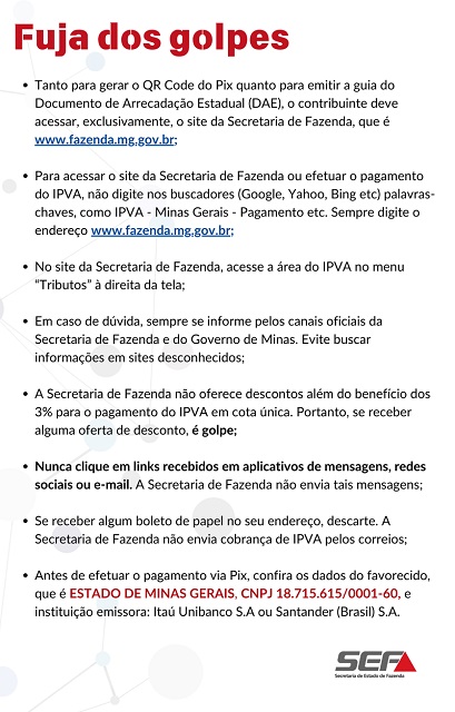 A Secretaria de Estado de Fazenda de Minas Gerais (SEF/MG) publicou nesta sexta-feira (27/12), o calendário de vencimentos e as regras do Imposto sobre a Propriedade de Veículos Automotores (IPVA) para 2025. O tributo passa a ser cobrado em fevereiro pelo Governo de Minas, dando mais fôlego às famílias mineiras no início do ano, quando há diversas outras despesas e contas para pagar.