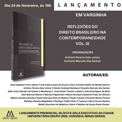 Além do capítulo que compõe o Volume III de “Reflexões do Direito Brasileiro na Contemporaneidade”, João Victor é coautor de outras três obras publicadas pela Editora CRV. Ele também é autor do livro “Paradoxo da Acessibilidade da Justiça e Exclusão Digital na Comarca de Três Pontas”, produzido durante sua tese de Doutorado. E os projetos continuam avançando: João Victor revela a coautoria em um novo livro que será lançado pelo Instituto Brasileiro de Ensino, Desenvolvimento e Pesquisa (IDP).