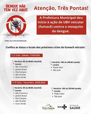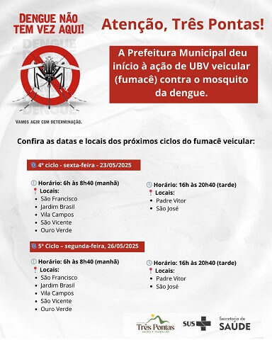 Diante do aumento expressivo no número de casos de Dengue nas últimas semanas, a Prefeitura de Três Pontas intensifica as ações de combate ao mosquito Aedes aegypti com o uso do UBV Veicular, popularmente conhecido como fumacê pesado, em uma ação emergencial aprovada pela Superintendência Regional de Saúde de Varginha (SRS/VG) e pela Coordenação Estadual de Vigilância de Arboviroses.