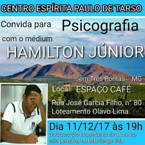O Centro Espírita “Paulo de Tarso” oferece nova oportunidade para os trespontanos. Depois de receber o médium Nilton Stuqui em uma noite especial e emocionante, quando 13 famílias receberam Cartas Consoladoras de seus entes queridos desencarnados, a instituição traz mais um nome que se destaca na Psicografia. Na próxima segunda-feira (11) estará em Três Pontas Hamilton Júnior.