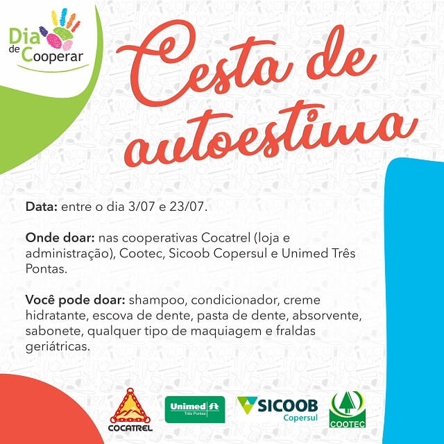 No mês em que é comemorado o Dia Internacional do Cooperativismo (3 de julho), as cooperativas Cocatrel, Cootec, Sicoob Copersul e Unimed Três Pontas se unem novamente para celebrar mais uma edição do Dia de Cooperar, iniciativa que tem como objetivo desenvolver projetos de responsabilidade social, por meio de ações de parcerias e voluntariado.