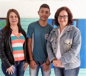 A diretora Luciana, o aluno Wexkley e a professora Rozana Tavares