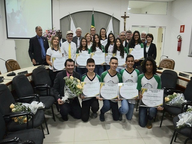 Após as votações dos projetos que constavam na Ordem do Dia, houve a entrega das honrarias. De iniciativa dos vereadores Roberto Donizetti Cardoso, Marlene Lima e Maycon Douglas Vitor Machado os estudantes da Escola Estadual “Monsenhor João Batista da Silveira” receberam no Plenário Moções de Aplausos e Congratulações – que são concedidos àqueles que se destacam na comunidade em diversos segmentos. No caso dos estudantes, foi devido à conquista da Medalha de Bronze nas Olimpíadas de Matemática disputadas na Tailândia este ano. Os alunos participantes estiveram no país asiático não só representando a Escola, mas também o município e o estado de Minas Gerais. A homenagem se estendeu também à diretora e à professora de Matemática da Escola pelo incentivo e participação com os estudantes nesta grande conquista.