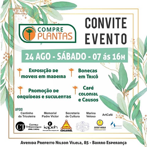 Além das histórias do Evento Cultural, que terá início às 10 horas, o Compre Plantas preparou uma série de outras atrações, dentre elas, Café Colonial e Exposição de Móveis em Madeira Resinada. Tudo rodeado de flores e plantas raras que acabaram de chegar à empresa, de mudas de temperos, ervas e hortaliças, enfim, dentro de um ambiente rico em natureza, em harmonia, em opções. “Teremos promoções de orquídeas, cactos, suculentas, árvores e palmeiras”, completa o empreendedor Sávio Martins.