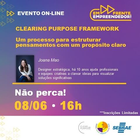 O Workshop on-line “Clearing Purpose Framework“, organizado pelo Sebrae Minas, será realizado nesta segunda-feira (8), às 16h. As inscrições podem ser feitas no link de inscrição.