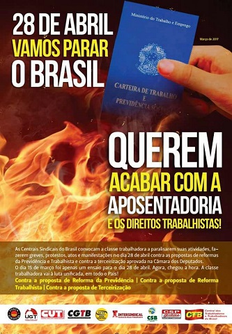 Através da convocação “Vamos parar o Brasil” CUT, UGT, CTB, Força Sindical, CSB, NCST, Conlutas e CGTB esperam que a greve nacional seja a maior mobilização da classe trabalhadora e de diversos setores da sociedade dos últimos 30 anos no País. “Os sindicatos estão mobilizando suas bases, aprovando a participação das categorias em assembleia”, diz o Secretário-Geral da CUT em São Paulo, João Cayres.